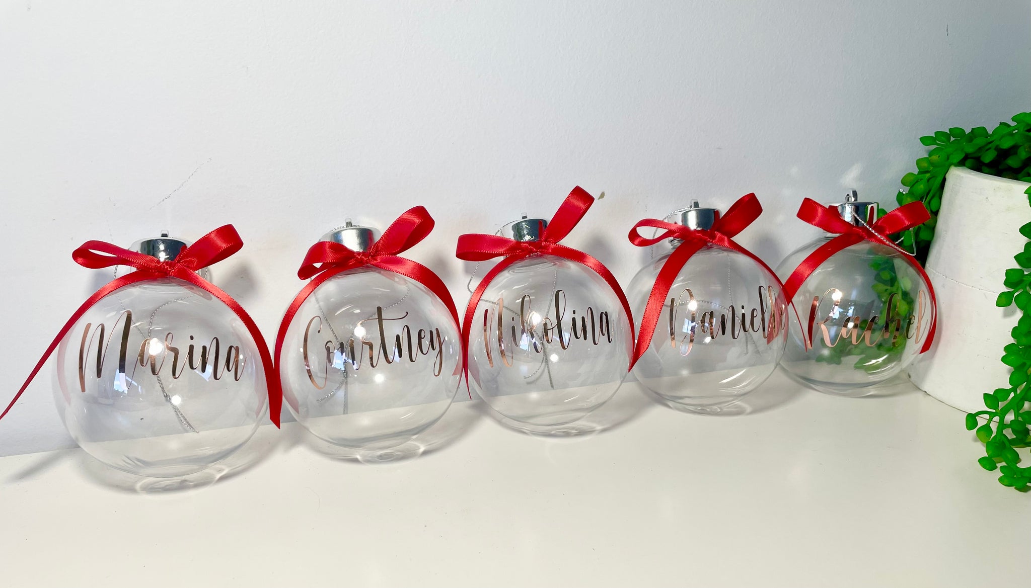 Personalised Glass Christmas Baubles! Heaps of colour bows and text options to choose from!